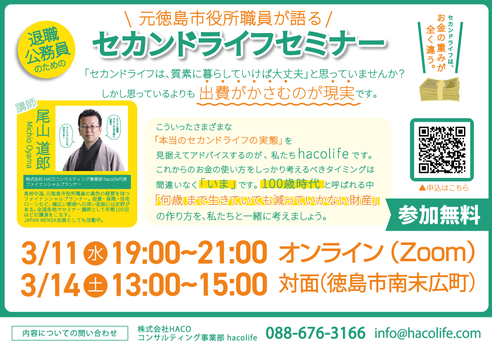 退職公務員のためのセカンドライフセミナー 更新日:2026年2月6日 公開日:2026年2月1日 対面セミナーwebセミナーライフプランセミナー公務員向けマネーセミナー 「セカンドライフは、質素に暮らしていけば大丈夫」と思っていませんか? しかし思っているよりも出費がかさむのが現実です。 こういったさまざまな「本当のセカンドライフの実態」を見据えてアドバイスするのが、私たちhacolif […] 続きを読む