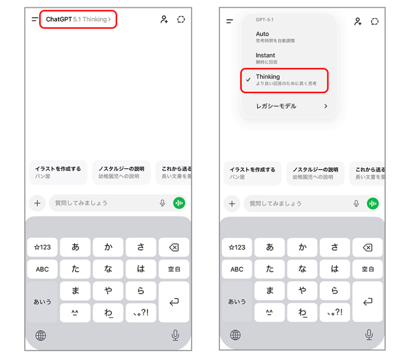 Geminiでは思考モード、ChatGPTならばThinkingモードの方が安定して動作しますが、反応に時間がかかります。
