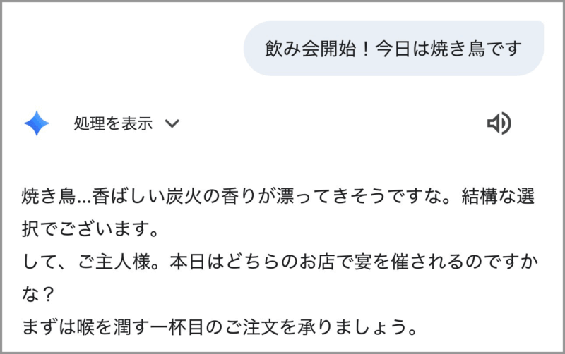 場所や「乾杯」の合図を送ります。お店の名前を入れると、執事が反応してくれるかも?