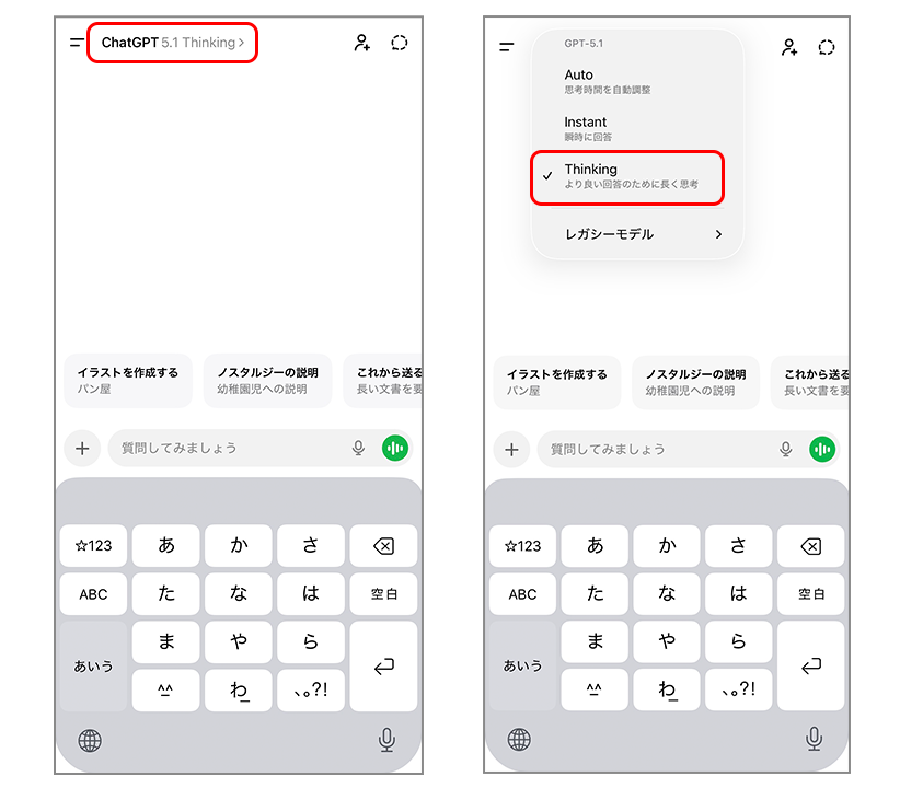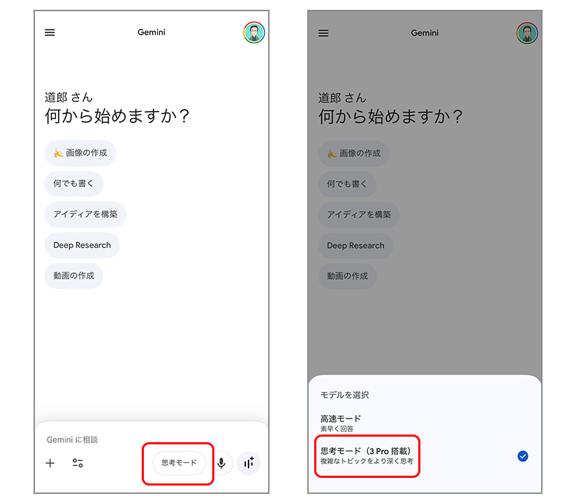 Geminiでは思考モード、ChatGPTならばThinkingモードの方が安定して動作しますが、反応に時間がかかります。