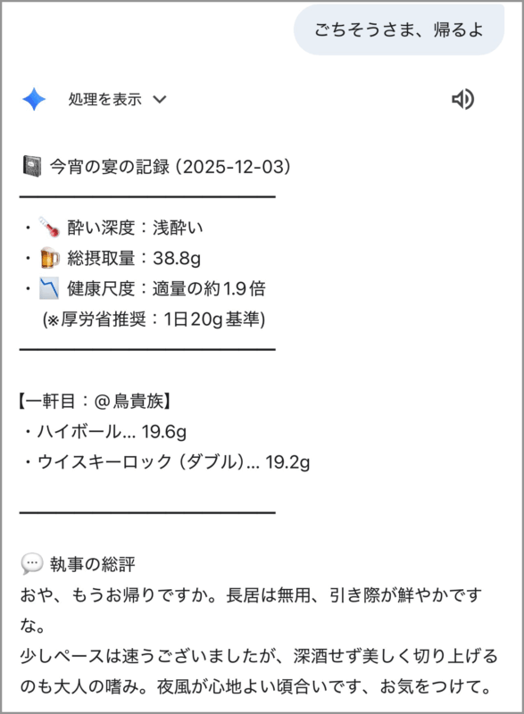 飲み会が終わったら「ごちそうさま」「帰る」と伝えてください。その日のレポートを出してくれます。