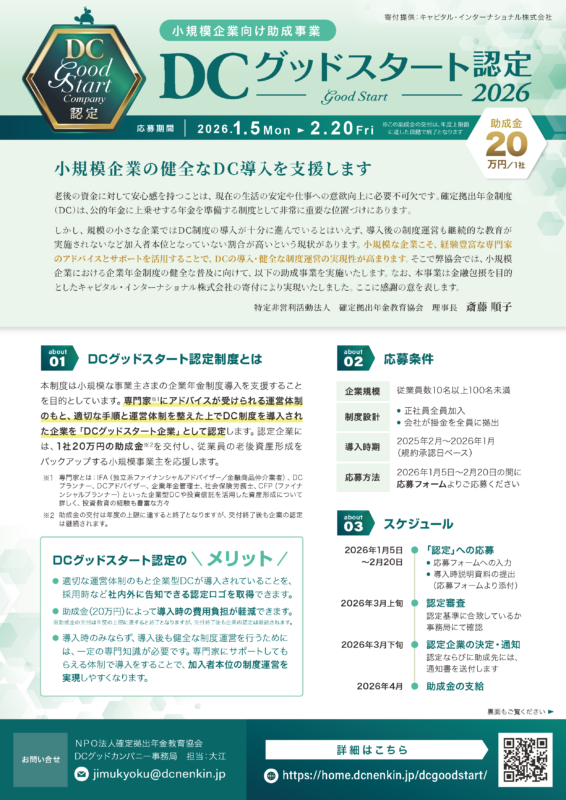 そんなコストにお悩みの中小企業に向けた、制度導入支援の助成金制度「DCグッドスタート認定」が始まっています(※受給には条件があります)。