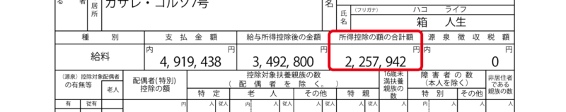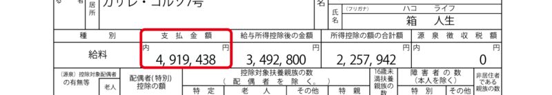 一番上の段にある大きな数字です。手取り額(口座に振り込まれた金額)よりもかなり多いはずですが、これがボーナスなどもすべて含んだ「年収(額面)」です。ここから税金や社会保険料が引かれて、皆さんの手取りになります。