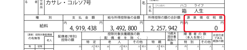 サンプルを見てみると、なんとこの源泉徴収税額が「0円」になっています。これは間違いではなく、先ほどの「④ 住宅ローン控除」で税金が全額相殺されたためです。もし毎月の給与から税金が引かれていたなら、年末調整でその全額が手元に戻ってきているはずです。